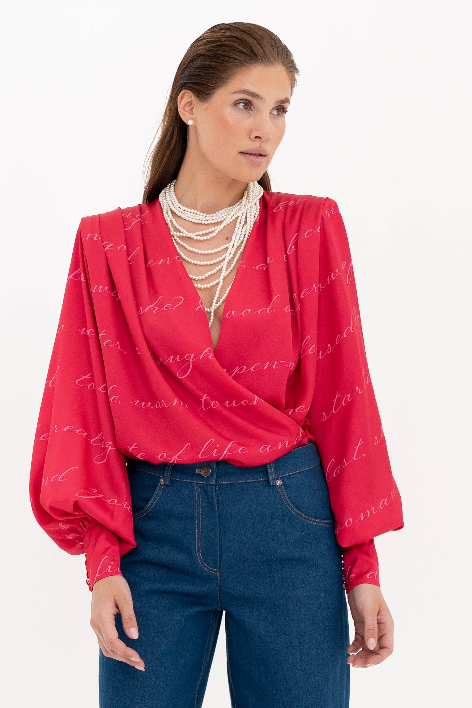 Model height - 178 cm, hips - 93 cm, waist - 63 cm, bust - 88 cm. Model is wearing M size blouse.