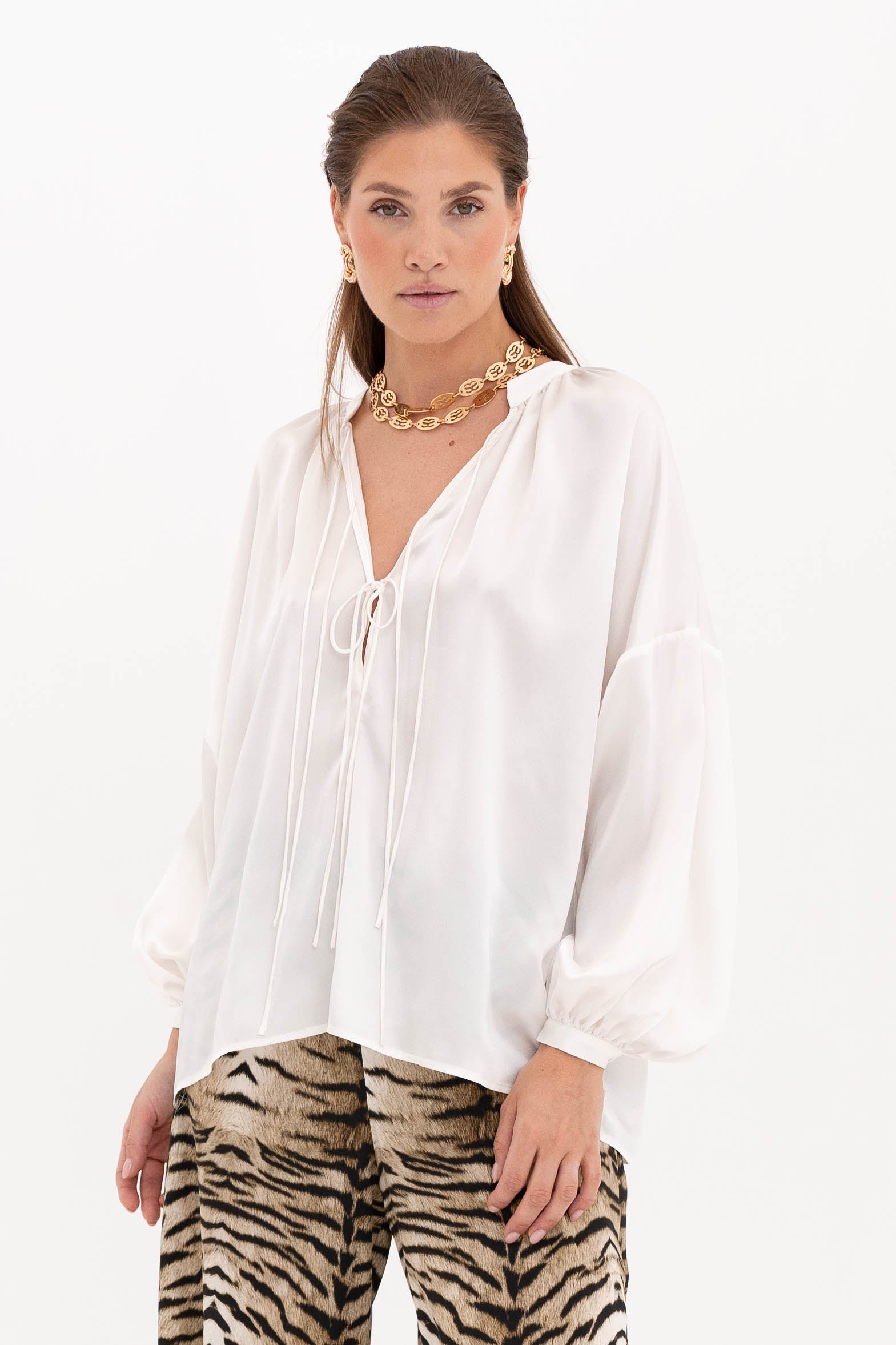 Model height - 178 cm, hips - 93 cm, waist - 63 cm, bust - 88 cm. Model is wearing one size blouse.